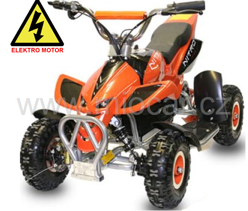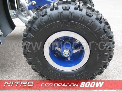 Silný elektromotor 800W přenáší výkon řetězem na obě kola zadní nápravy. Díky gumovým nafukovacím pneumatikám s offroad vzorkem má čtyřkolka vynikající trakční schopnosti. V žádném případě nelze tyto čtyřkolky srovnávat s elektrovozítky s plastovými koly, které mají náhon pouze na jedno kolo a neporadí si ani s malým kopečkem natož terénem.
