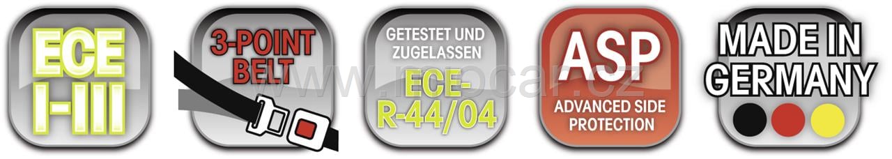 Bezpečnostní pásy mají důmyslný tvar, aby neškrábaly na krku dítěte, jsou vyplněny hmotou tlumící tlak v případě nehody a vybaveny protiskluzovou gumou, která zamezí rozlézání pásku po oděvu při brždění. Důmyslná konstrukce ASP (Advanced Side Protection) se postará o maximální bezpečí v případě nárazu, který je eliminován pevnými bočnicemi a bohatým polstrováním.