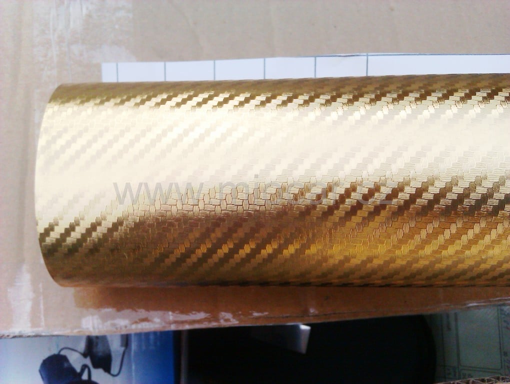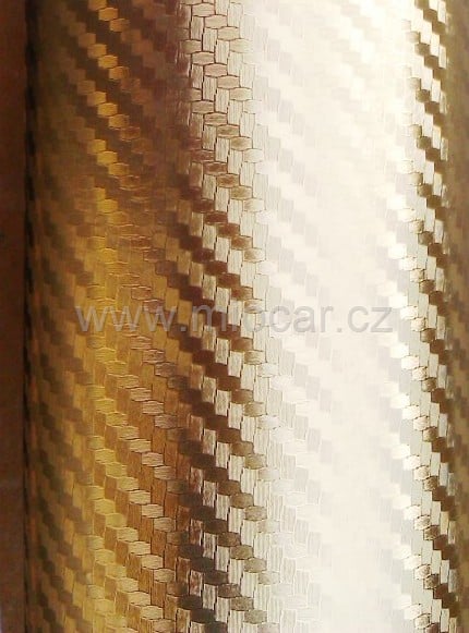 3D dekorační folie, imitace carbon (zlatá barva) vhodná do interiéru tak i na exteriéru. Po nahřátí fénem dobře tvarovatelná, odolná vůči mrazu a slunečnímu záření.