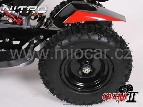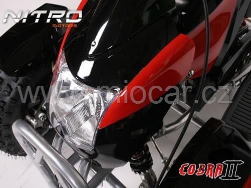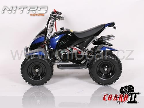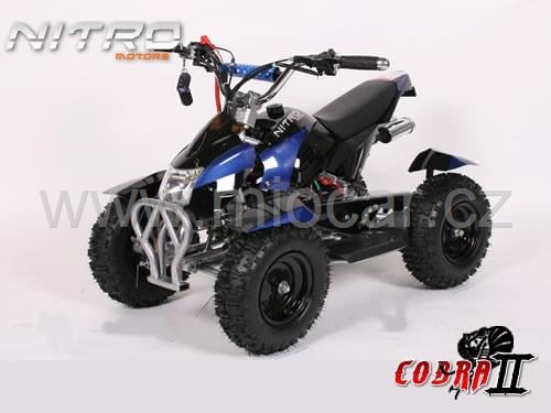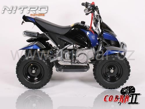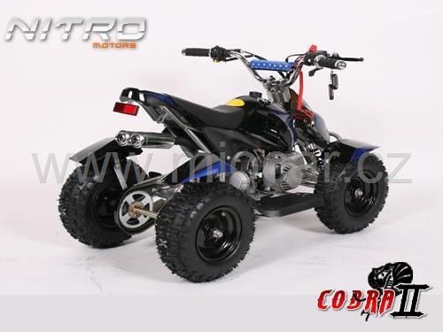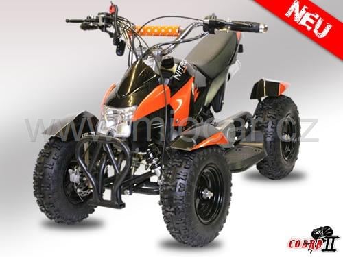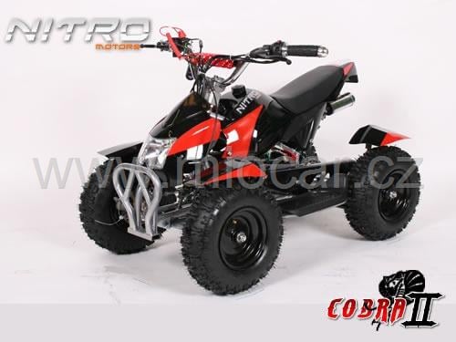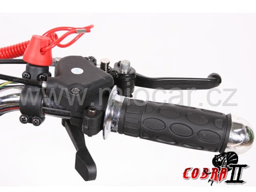 Dětská čtyřkolka ATV Cobra 2 49cc se vyznačuje celou řadou vylepšení jako jsou - výtrhová pojistka, možnost omezení plynu na rukojeti, výborné krytí řetězu, zesílený rám (nosnost až 80kg), přední a zadní kotoučové brzdy, přední čepy v silonových pouzdrech, sportovní vzduchový filtr, velká kola 6 palců, centrální zadní tlumič, převodovka pro větší výkonost v terénu, elektrický starter na dálkové ovládání (start/stop + alarm) a celokovové startování. Čtyřkolka je celoodpružená.