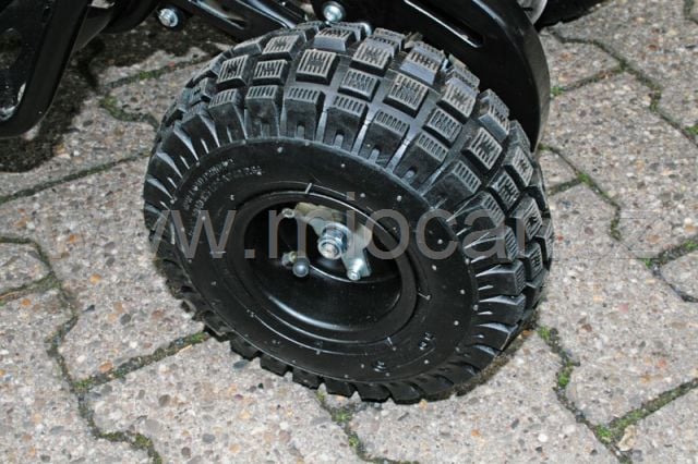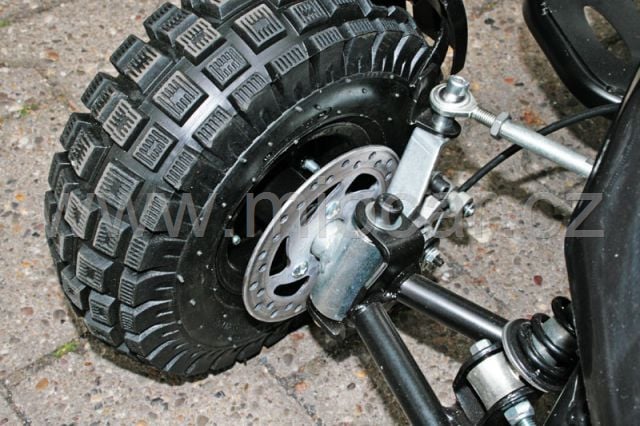 Díky gumovým nafukovacím pneumatikám s offroad vzorkem má čtyřkolka vynikající trakční schopnosti. Silný motor o výkonu 3,4 koně je přenášen řetězem na obě kola zadní nápravy.