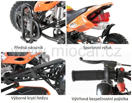 Z hlediska bezpečnosti má tento miniquad co nabídnout: spínací klíček, zesílená zadní náprava, výborné krytí řetězu, ovládání plynu palcem, možnost omezení rychlosti pro děti.