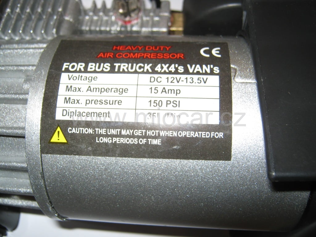 Výkonější kovový kompresor, vestavěný tlakoměr, napájení 12V ze zástrčky zapalovače vozu.