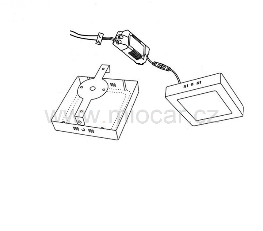 Přiložený držák uchytit 2 až 4 vruty na požadované místo. Propojit stávající kabely 220V s trafem L N a následně tělo svítilny přišroubovat dvěma šroubky do držáku.