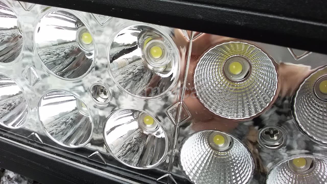 Krajní LED mají odlišně tvarované odrazové hrnečky pro lepší lom světla, rozptyl 60C° tkzv COMBO. Led ve středu světla mají světelný rozptyl 30C°.