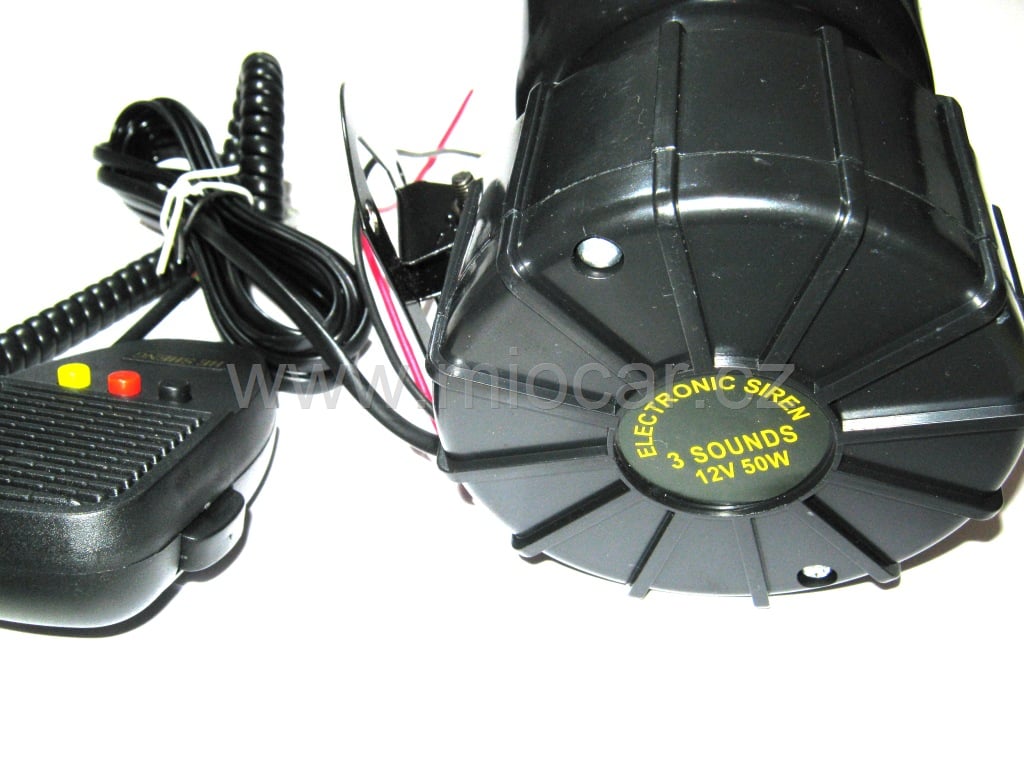 Siréna s kabelem do interieru kde je příruční mikrofon jako u vysílačky na mluvené slovo + 3 tóny (2x policie, sanitka).