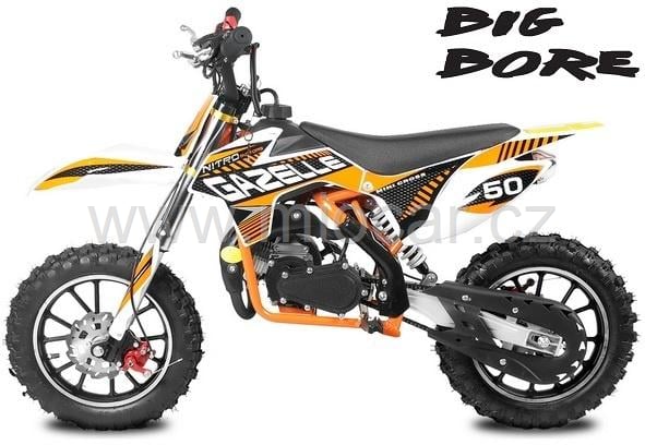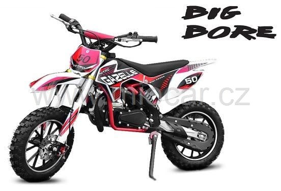 Minibike cross Big Bore Gazelle je s 3.7 kW nejvýkonější mini motorka ve své třídě. Předností tohoto modelu je motorová sada Big Bore, tuningový 15mm karburátor a tuningová 2-paknová odstředivá spojka. Gazelle BB nabízí již v základu tuning převodovku, sportovní vzduchový filtr, sportovní brzdové kotouče a laděný sportovní výfuk. O tlumení se starají přední tlumiče UP-side down a zadní centrální tuhostně nastavitelný tlumič.
