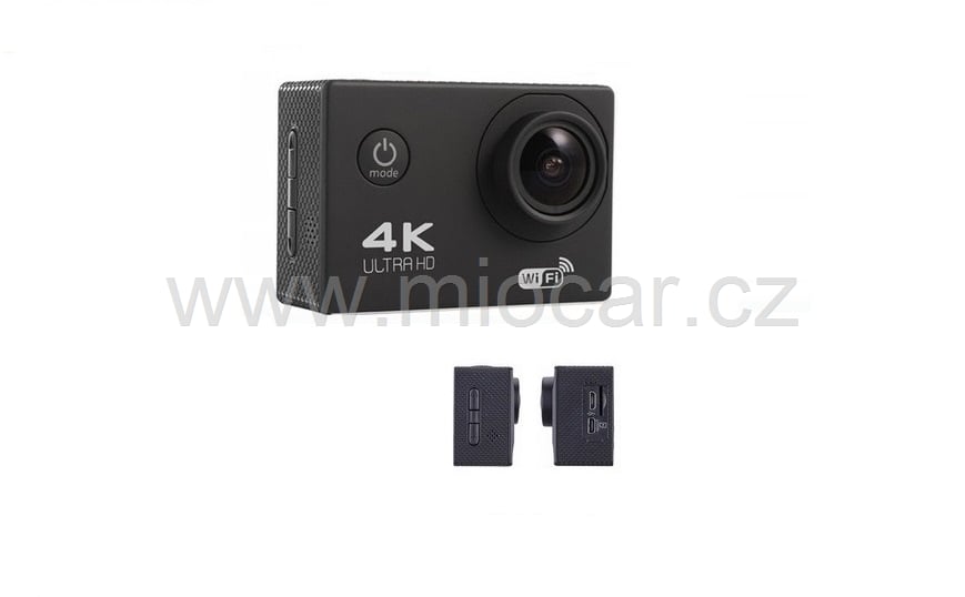 Balení obsahuje kameru Wifi s voděodolným pouzdrem, USB kabel pro nabíjení, adaptér do sítě 230V a sadu držáků pro uchycení kamery. Na přilbu, na řidítka, do vozidla..