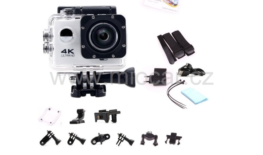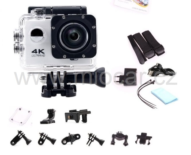Balení obsahuje kameru Wifi s voděodolným pouzdrem, USB kabel pro nabíjení, adaptér do sítě 230V a sadu držáků pro uchycení kamery. Na přilbu, na řidítka, do vozidla..