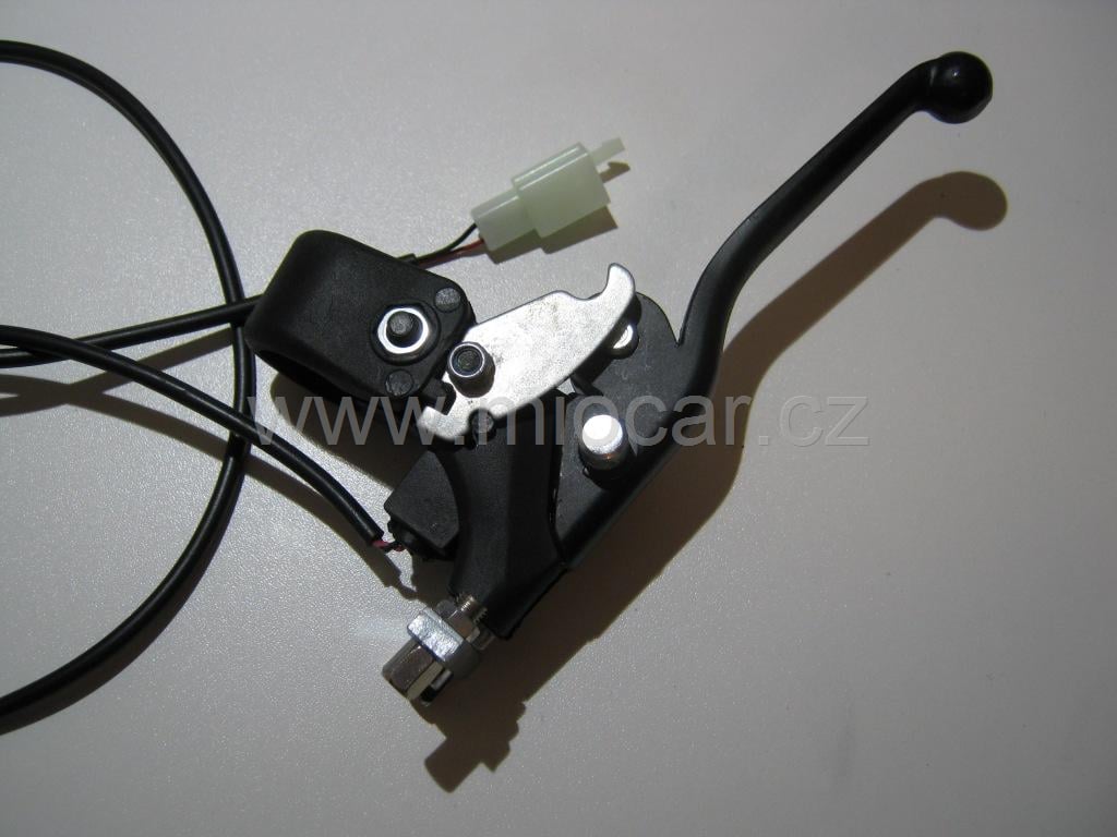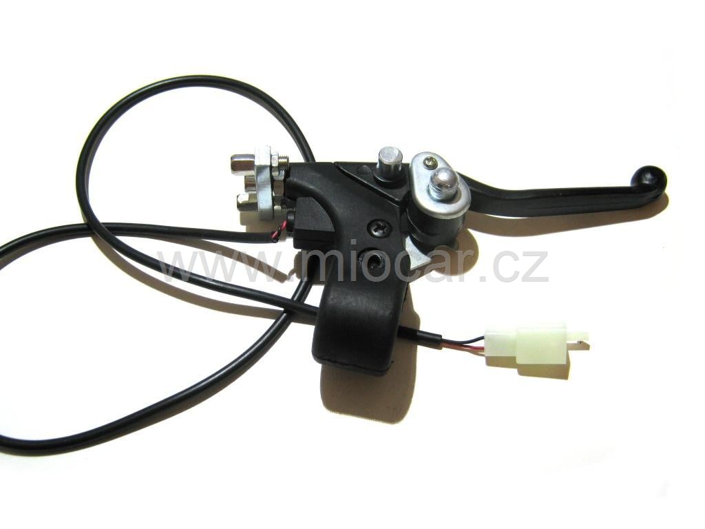 Kompletní brzdová páčka pro elektrické dětské čtyřkolky. Pravá strana na obě brzdy včetně objímky, aretace ruční brzdy a kabelu pro přerušení tahu motoru při brždění. viz fotografie