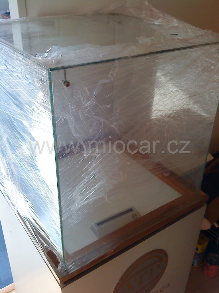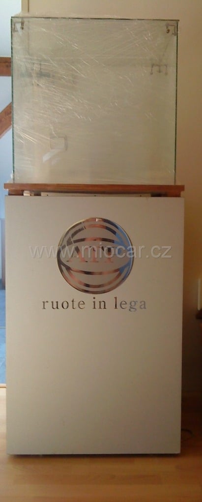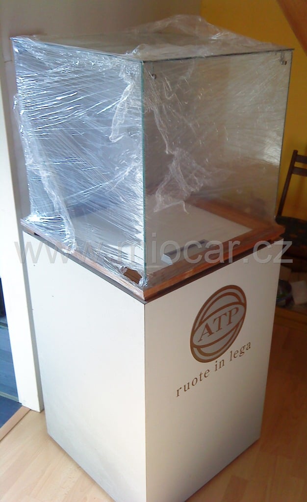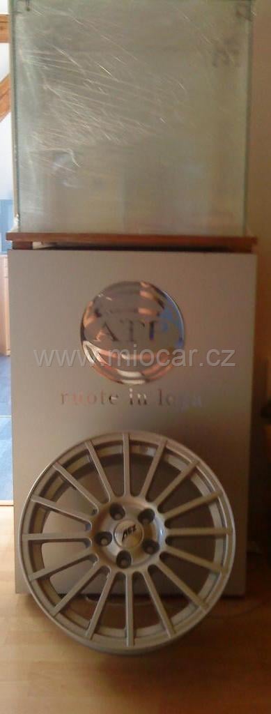 Výstavní stojan od ATP původně určený na výstavu AL ráfku včetně aretační zarážky proti pohybu vzorku.Lze použít téměř na cokoli. Podsvícený , materiál sklo a lamino (stříbrná barva) luxusní provedení. Na kolečkách.
