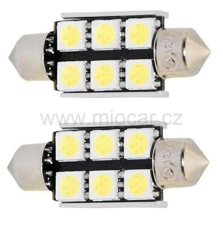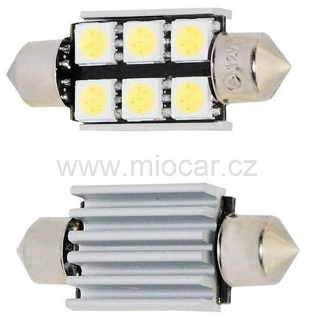 Led žárovka s paticí sufit. V panelu 6x led SMD5050 bílé barvy. Náhrada za sufit 39mm 12V. Funkce CAN-BUS zabraňuje signalizaci prasklé žárovky.
